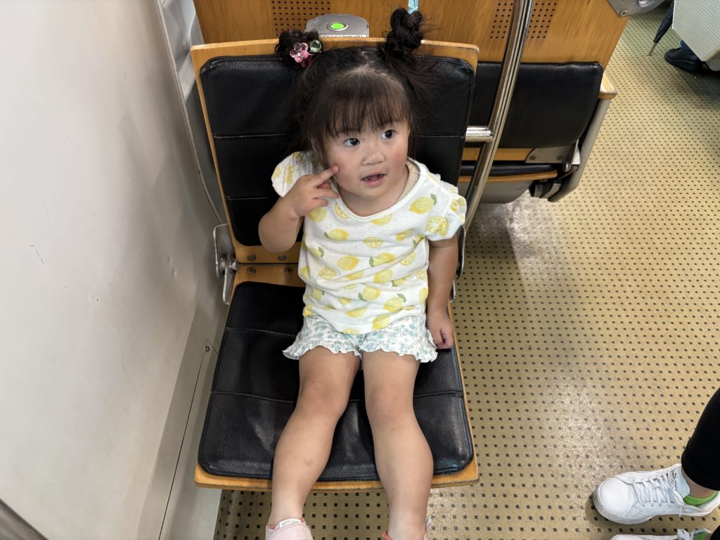 意外と乗客多く、席は空いてませんでしたが、紳士なオジサマがムスメちゃんにもう降りるから座っていいよ。と席を譲ってくださいました!