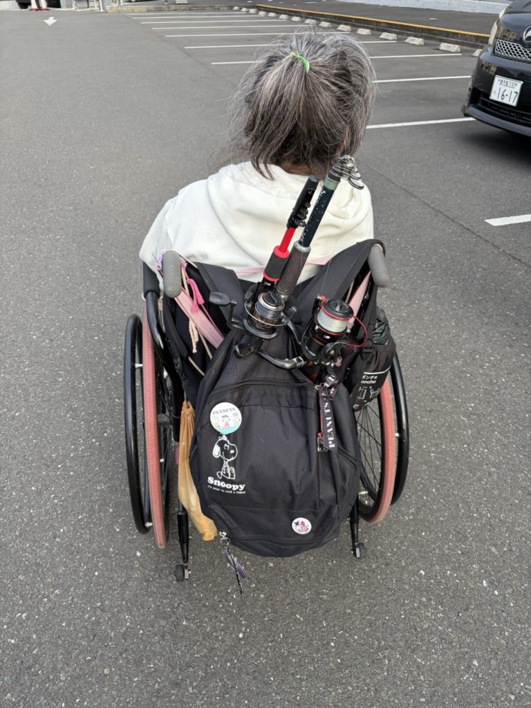 帰りはこんな感じで、リュックに自分の竿と介助者さんの竿を刺した形で帰りました。