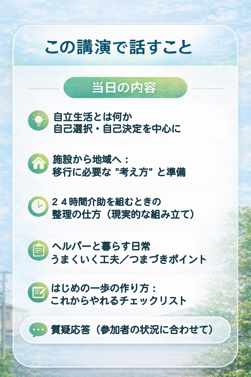 ※不安を煽るのではなく、現実に沿って「選べる状態」をつくる講演です。