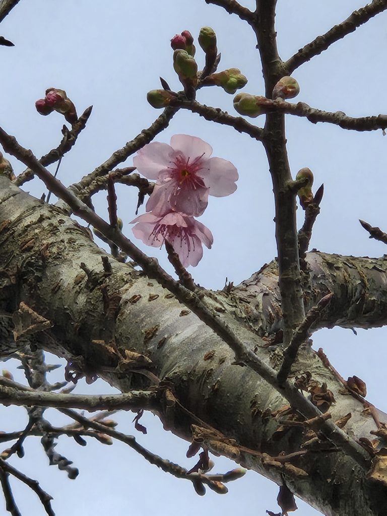 初日の出は見逃したけど、実家の庭の寒緋桜が二輪花開いていました。